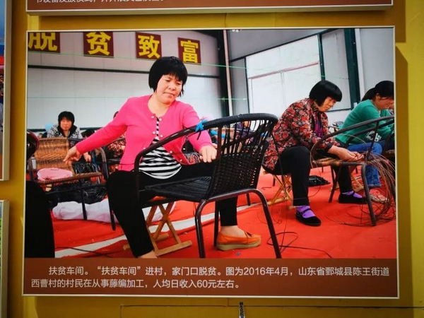 第五展區(qū)中關(guān)于扶貧的照片,大部分是生活化內(nèi)容,看上去十分真切、生動(dòng)。在展區(qū)一角,還有這么一張照片——這張照片是村民們從事藤編加工的照片,拍攝于山東鄄城西曹村,從照片上可以看到,3名婦女正在編織藤椅。據(jù)了解,她們的人均日收入能達(dá)到60元左右。這張照片也是解說員介紹的重點(diǎn)。