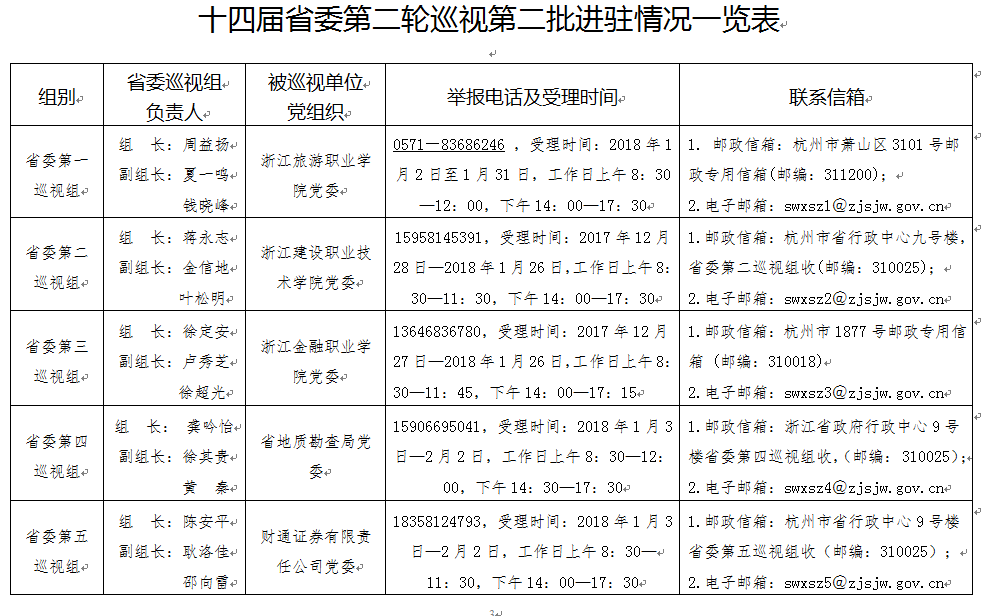 據(jù)悉,第二批進(jìn)駐的10家單位分別是省統(tǒng)計(jì)局、省人民防空辦公室、省地質(zhì)勘查局、省能源集團(tuán)有限公司、財(cái)通證券有限責(zé)任公司、浙江旅游職業(yè)學(xué)院、浙江商業(yè)職業(yè)技術(shù)學(xué)院、浙江金融職業(yè)學(xué)院、浙江建設(shè)職業(yè)技術(shù)學(xué)院、浙江工貿(mào)職業(yè)技術(shù)學(xué)院,每個(gè)單位集中巡視時(shí)間為期1個(gè)月左右。