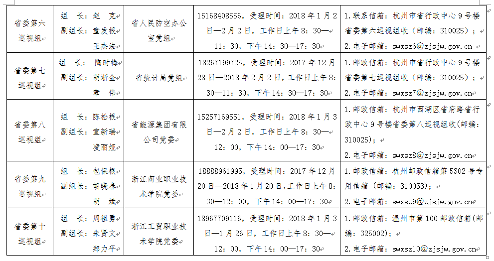 根據(jù)工作要求,省委巡視組主要受理反映被巡視黨組織領(lǐng)導(dǎo)班子及其成員、近5年來(lái)調(diào)離退休的領(lǐng)導(dǎo)班子原成員、下一級(jí)黨組織領(lǐng)導(dǎo)班子主要負(fù)責(zé)人和重要崗位領(lǐng)導(dǎo)干部問(wèn)題的來(lái)信來(lái)電來(lái)訪(fǎng)。巡視期間,省委各巡視組設(shè)立了專(zhuān)門(mén)的聯(lián)系電話(huà)和信箱。(浙江在線(xiàn)記者 丁謹(jǐn)之 通訊員 顏新文 汪志建)