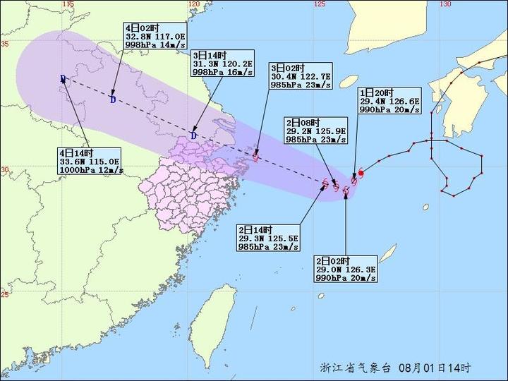 最新消息,今年第12號(hào)臺(tái)風(fēng)“云雀”(熱帶風(fēng)暴級(jí))今天(8月2日)08時(shí)位于距離浙江省舟山市東偏南方向約430公里的東海海面上,就是北緯28.7度、東經(jīng)126.4度,9級(jí)(23米/秒),985百帕。預(yù)計(jì),“云雀”將以每小時(shí)18公里左右的速度向西北方向移動(dòng),強(qiáng)度維持或略有增強(qiáng),并將于3日早晨到上午在浙江舟山到上海一帶沿海登陸(熱帶風(fēng)暴級(jí),8-9級(jí),18-23米/秒)。